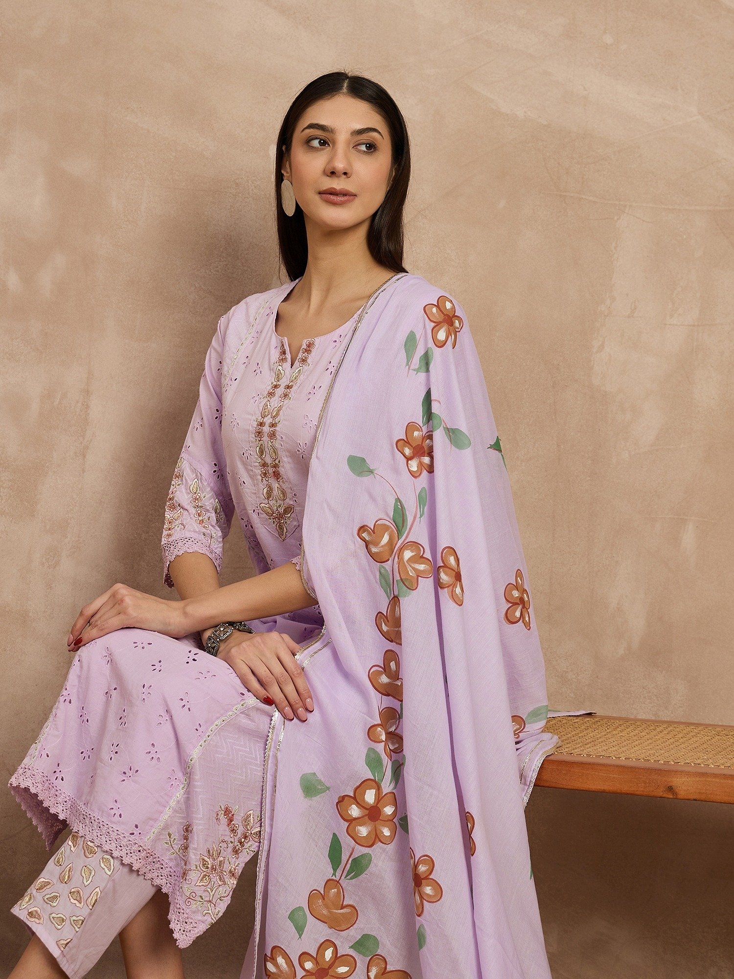Cotton Schiffli Embroidered Straight Kurta Pant and Dupatta