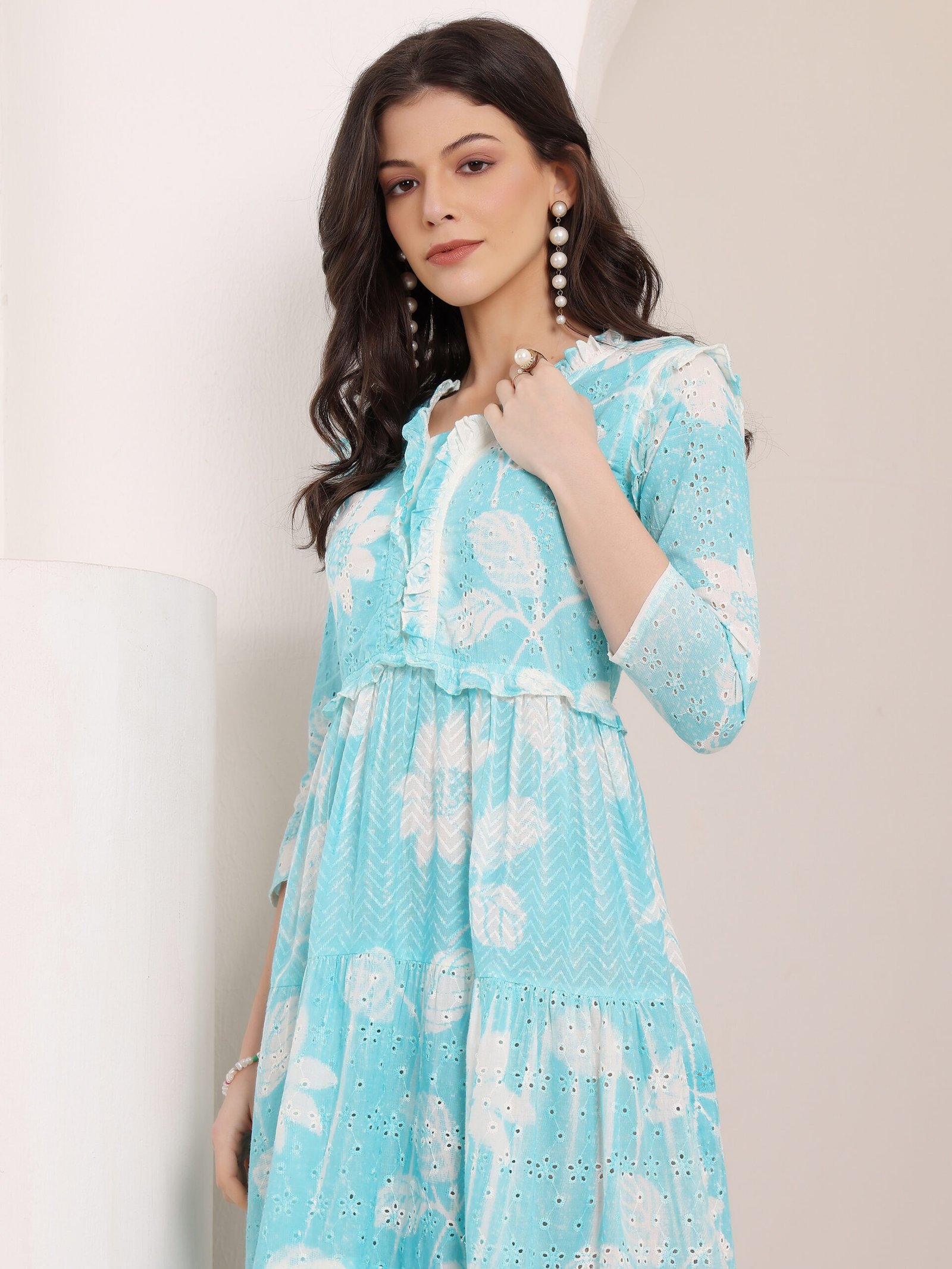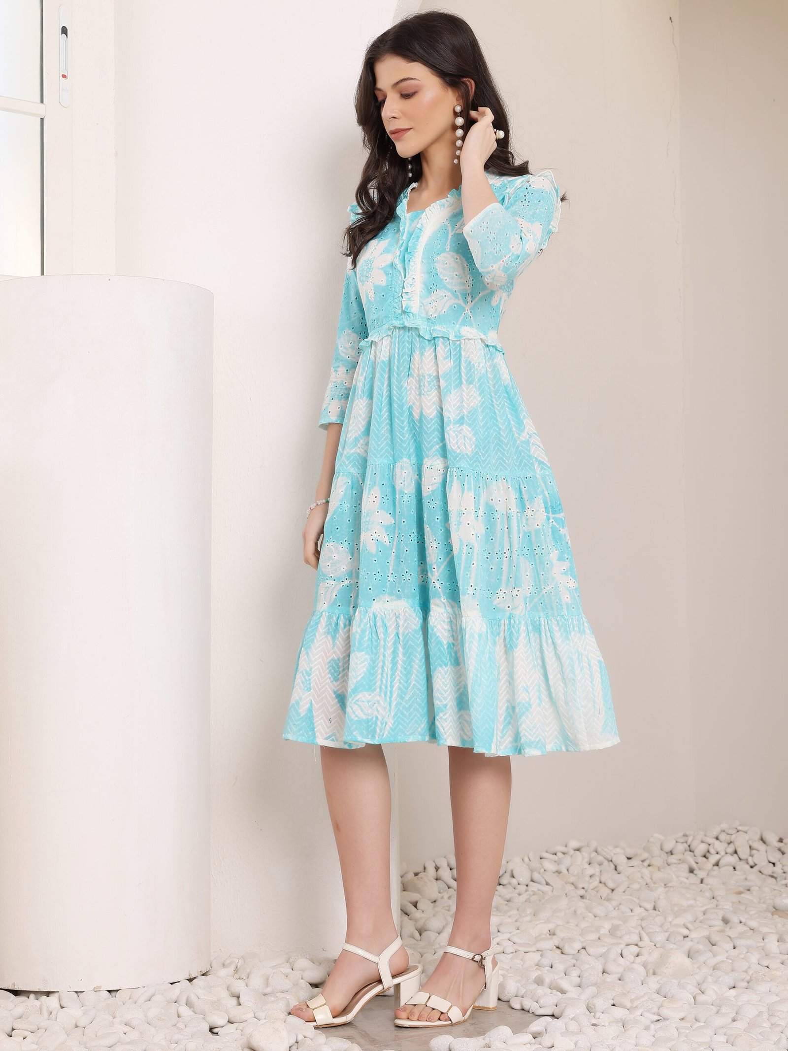 Cotton Schiffli Hand Printed Tiered A-Line Dress