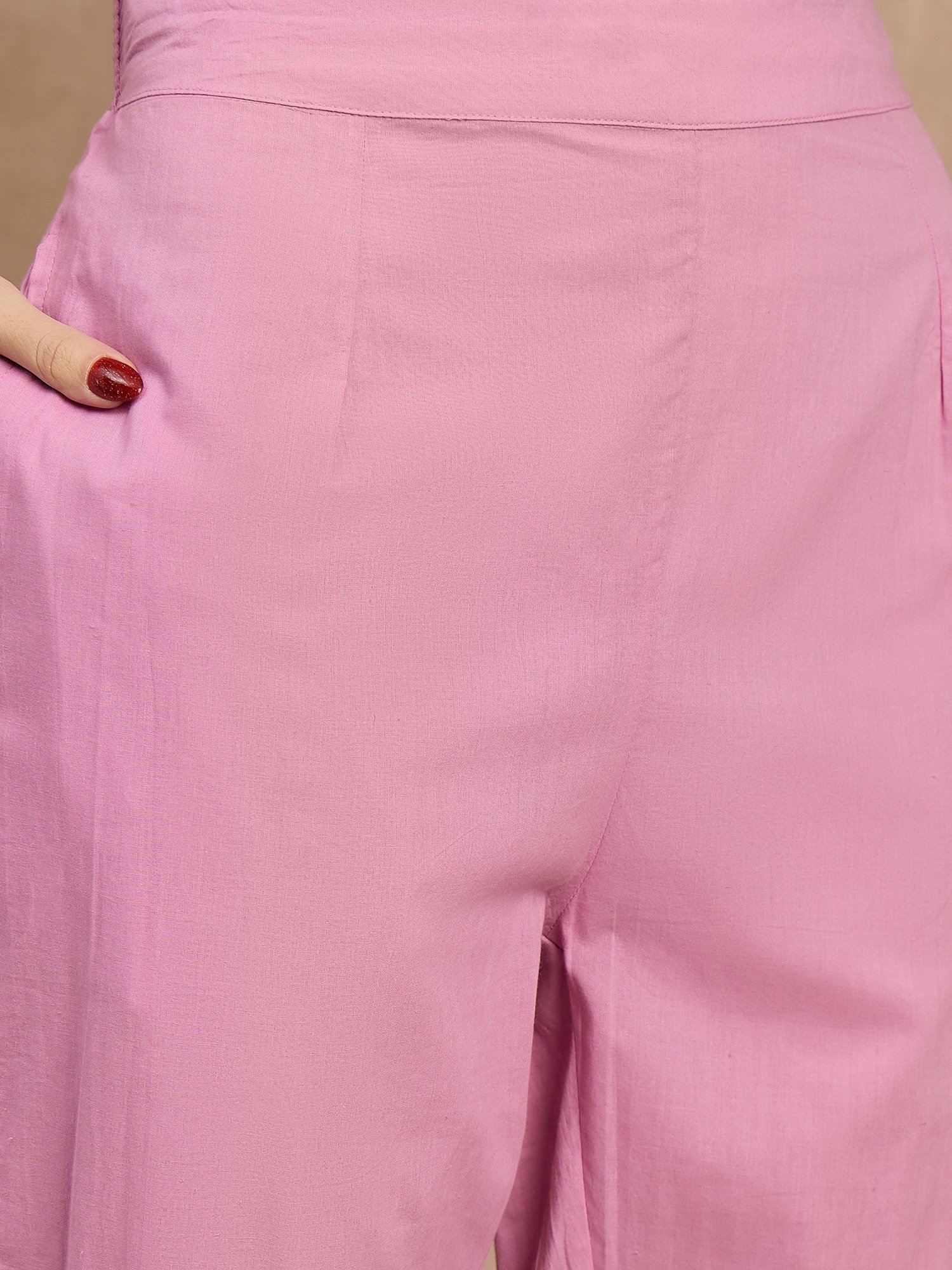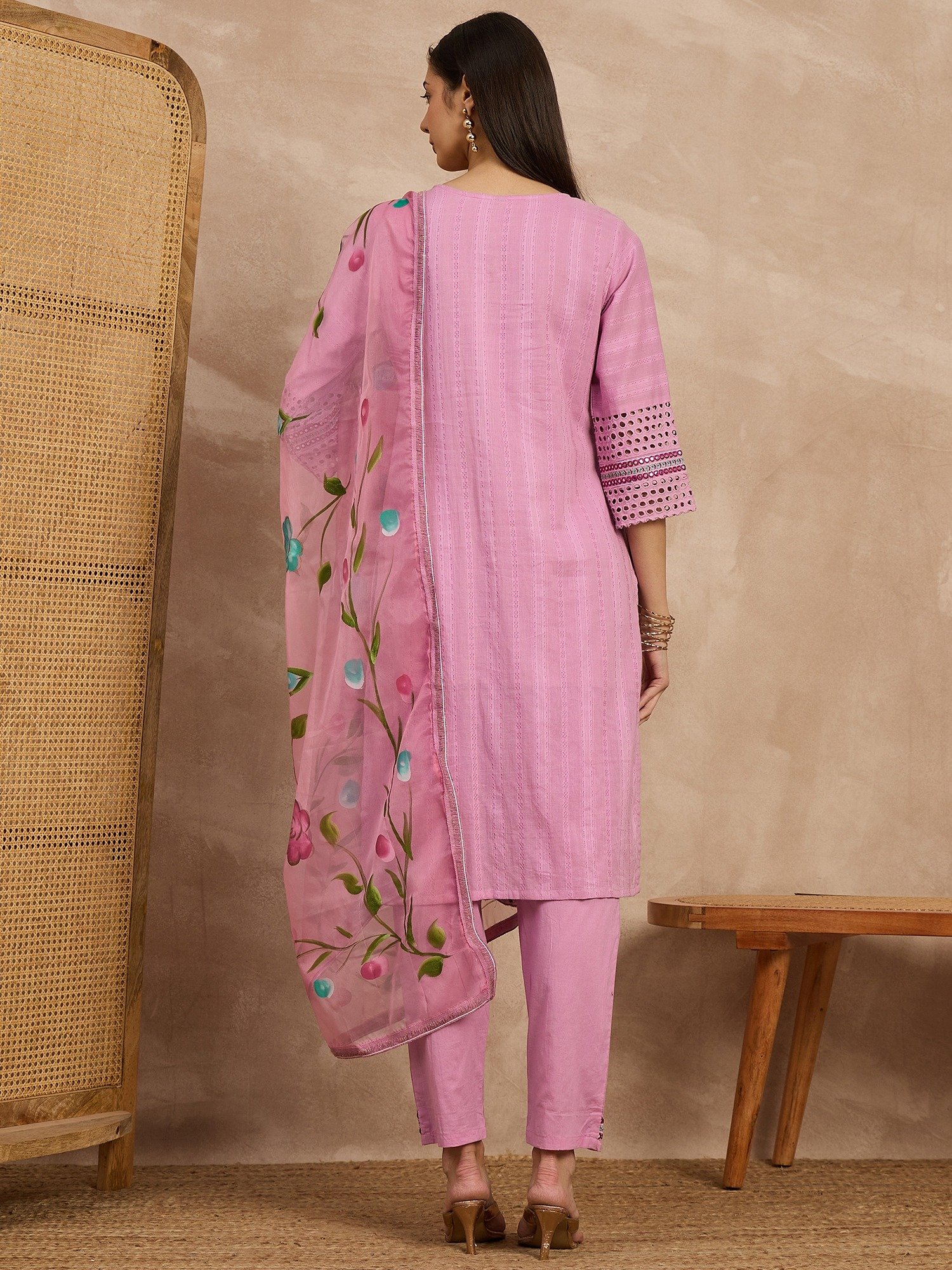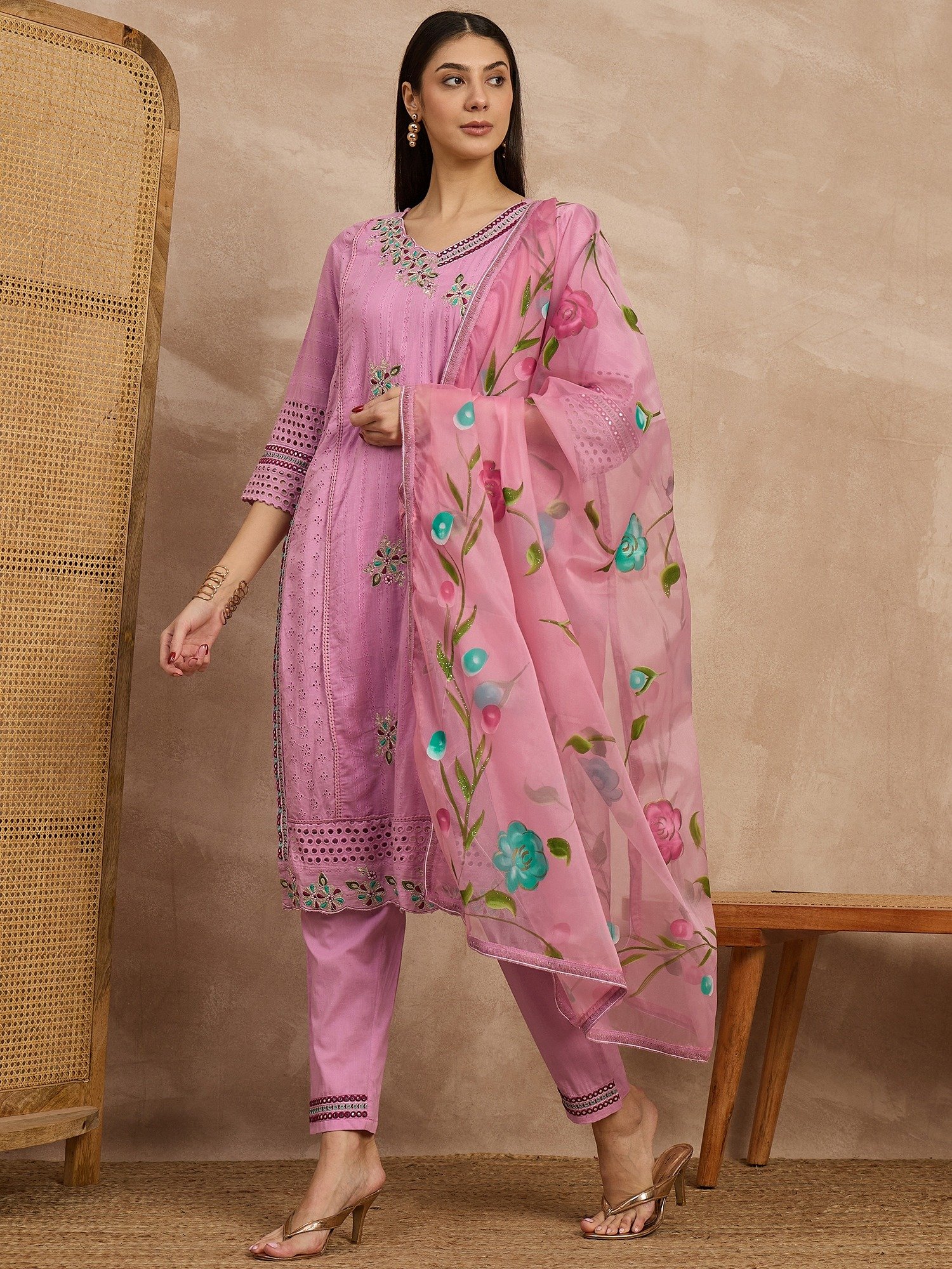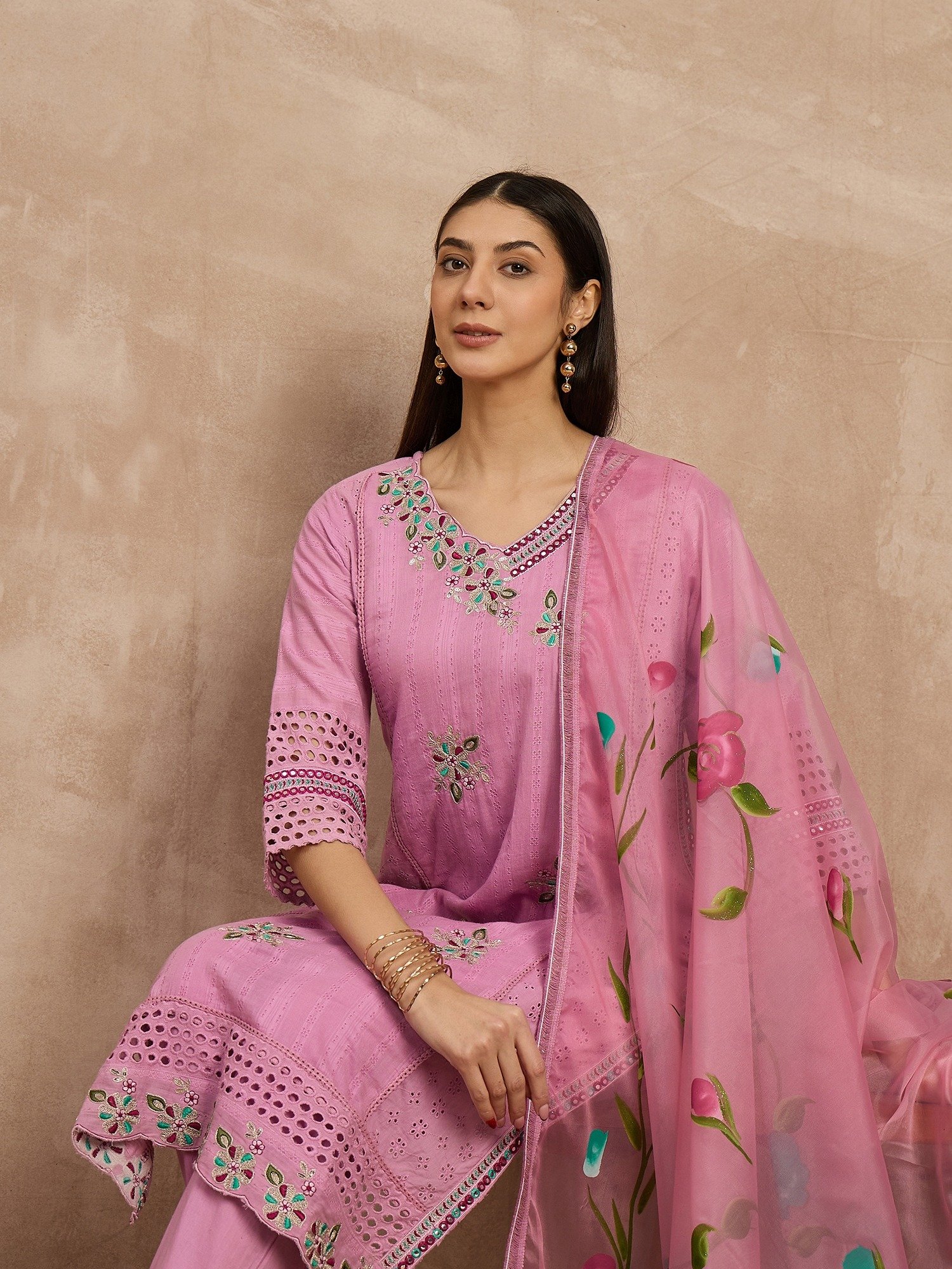 Schiffli V-Neck Mirror Work Kurta Pant and Dupatta